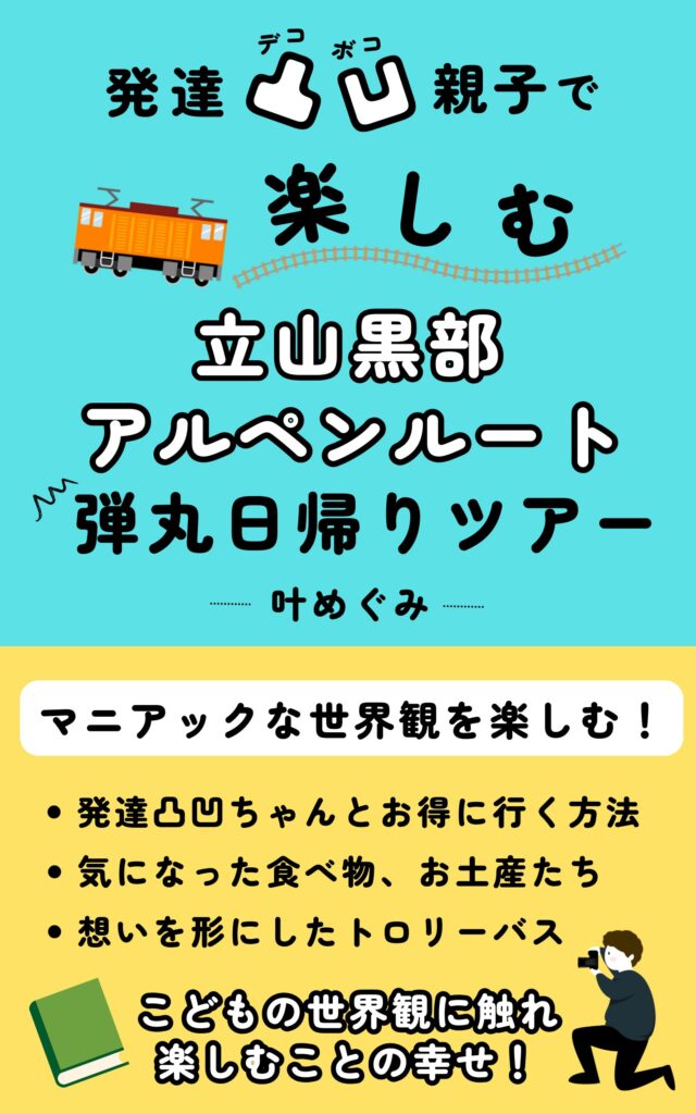 電子書籍 「自然体でうまくいく発達凸凹育児」 かつて空まわりばかりしてきた私が うまくいくきっかけは 「自然体」でした。 がんばってもがんばってもうまく行かない人に読んでもらえたら あなたの育児のヒントになるはず。 発達凸凹親子で楽しむ立山黒部アルペンルート日帰りツアー 発達凸凹の息子たちにとって立山黒部アルペンルートの魅力と言えば、何種類もの乗り物に乗れること! マニアックな世界観に触れてみませんか? 関連記事はこちら