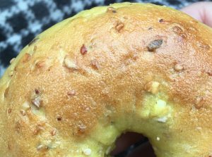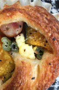 ソーセージ、かぼちゃ、いんげんが入ってる。クロワッサン生地でカリッとしたところとしっとりしたところがあり具の味もして美味しかった。