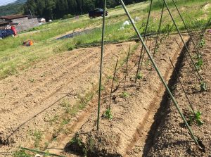 トマトが地を這うように成長を上に伸びるように 支柱をしてあげるのだとか。